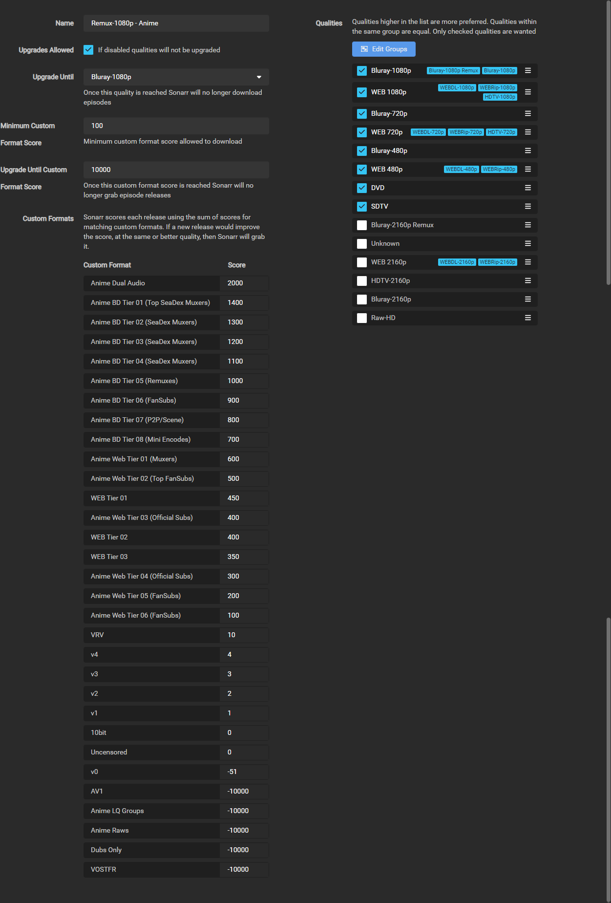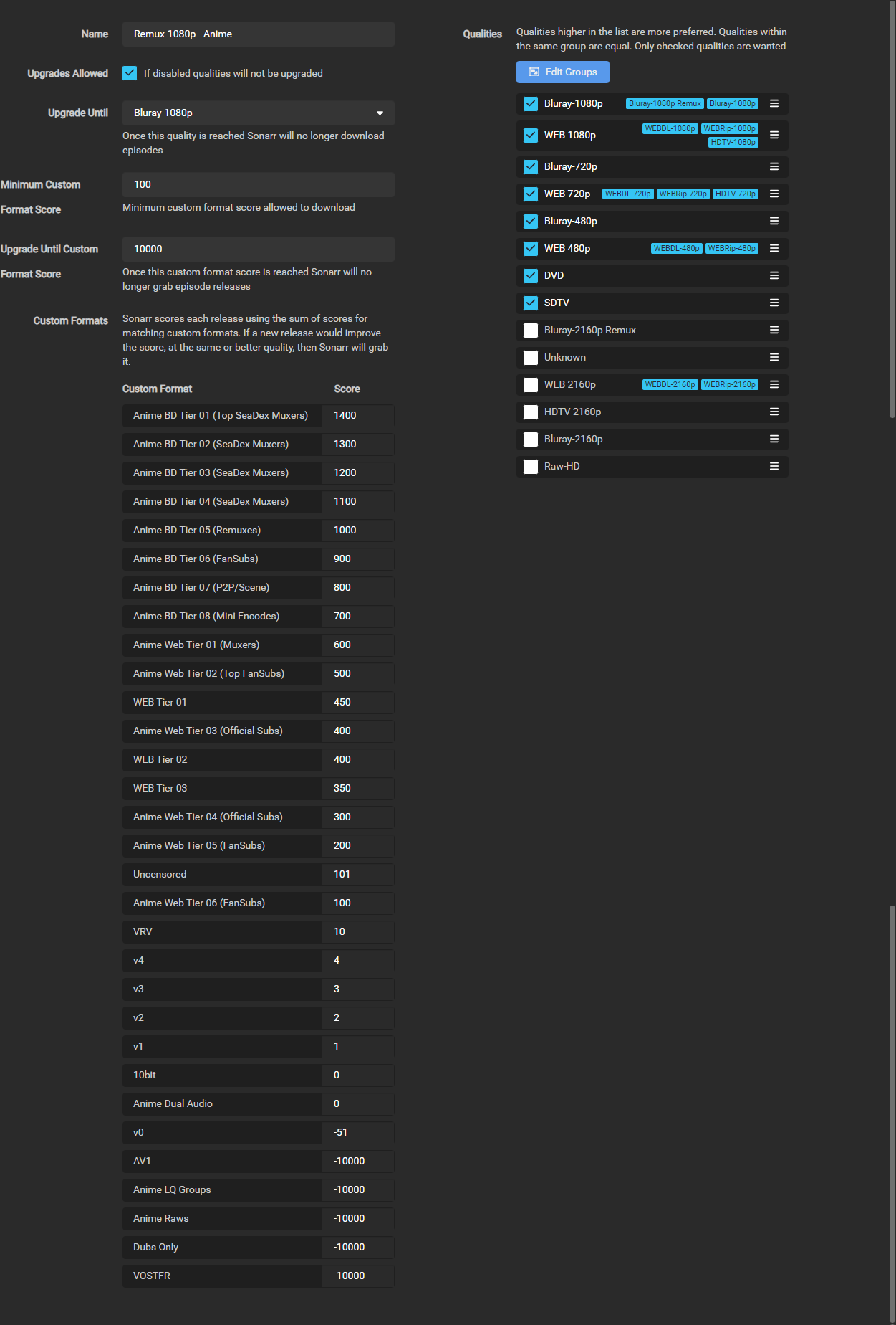 Once you have set your preferred scoring you will need to make one more change to your Remux-1080p - Anime profile.