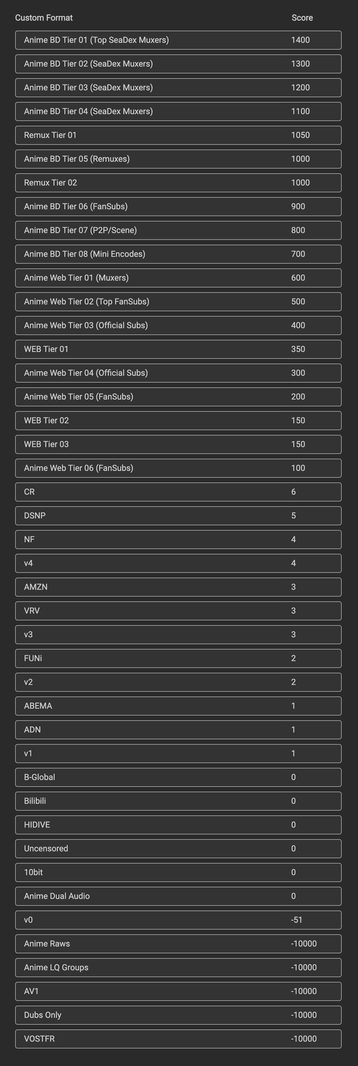 The scoring that has been set is the recommended scoring, however, some of the CFs are optional depending on what you prefer. Anime Dual Audio, Uncensored and 10bit can be given positive scores if you want to prefer content with these attributes.