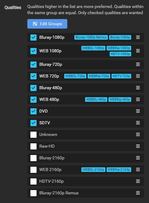 We need to add Bluray-1080p Remux and Bluray-1080p into a group together, HDTV-1080p into the same group as WEBDL-1080p and WEBRip-1080p, and HDTV-720p into the same group as WEBDL-720p and WEBRip-720p so that the scoring will work correctly.